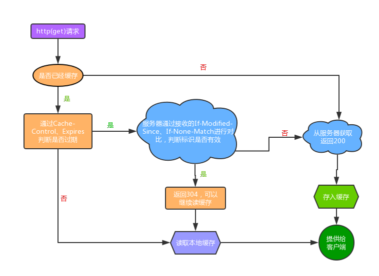 当请求服务器资源时,浏览器会先看本地是否有缓存,如果有缓存,则根据强缓存中的 expires 和 cache-control.max-age 判断缓存是否过期,如果没有过期则直接使用,如果已过期则向服务器请求资源,服务器会根据请求头中的信息判断资源是否能够继续使用,如果文件无变化能够继续使用则返回状态码 304,否则,重新返回状态码 200 和服务器端的资源。