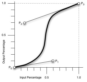 贝塞尔曲线曲线由四个点 P0,P1,P2 和 P3 定义。P0 和 P3 是曲线的起点和终点。P0是(0,0)并且表示初始时间和初始状态,P3是(1,1)并且表示最终时间和最终状态。