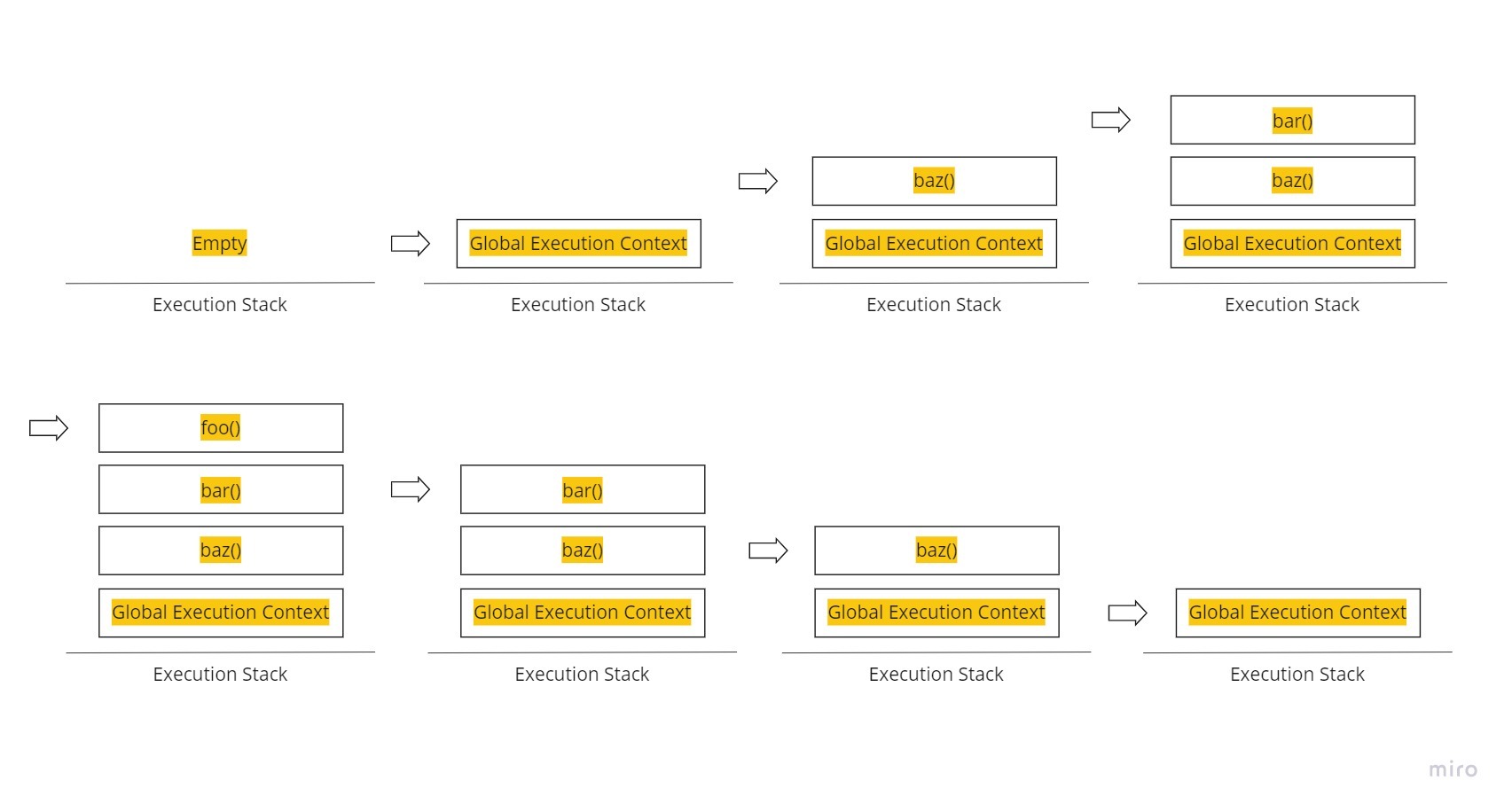 - 当执行一个函数时,就会创建一个执行上下文,并压入执行上下文栈中,然后执行函数内的代码,当函数执行完毕时,其执行上下文会从栈顶弹出,并将函数返回值赋给调用函数的变量;