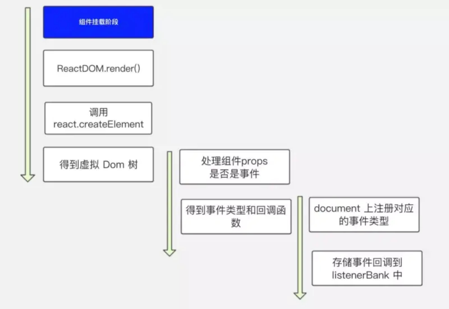 挂载完成后,判断是否含有事件,如果有则在 document 上完成事件注册,并存储回调函数至 listenerBank 中;
