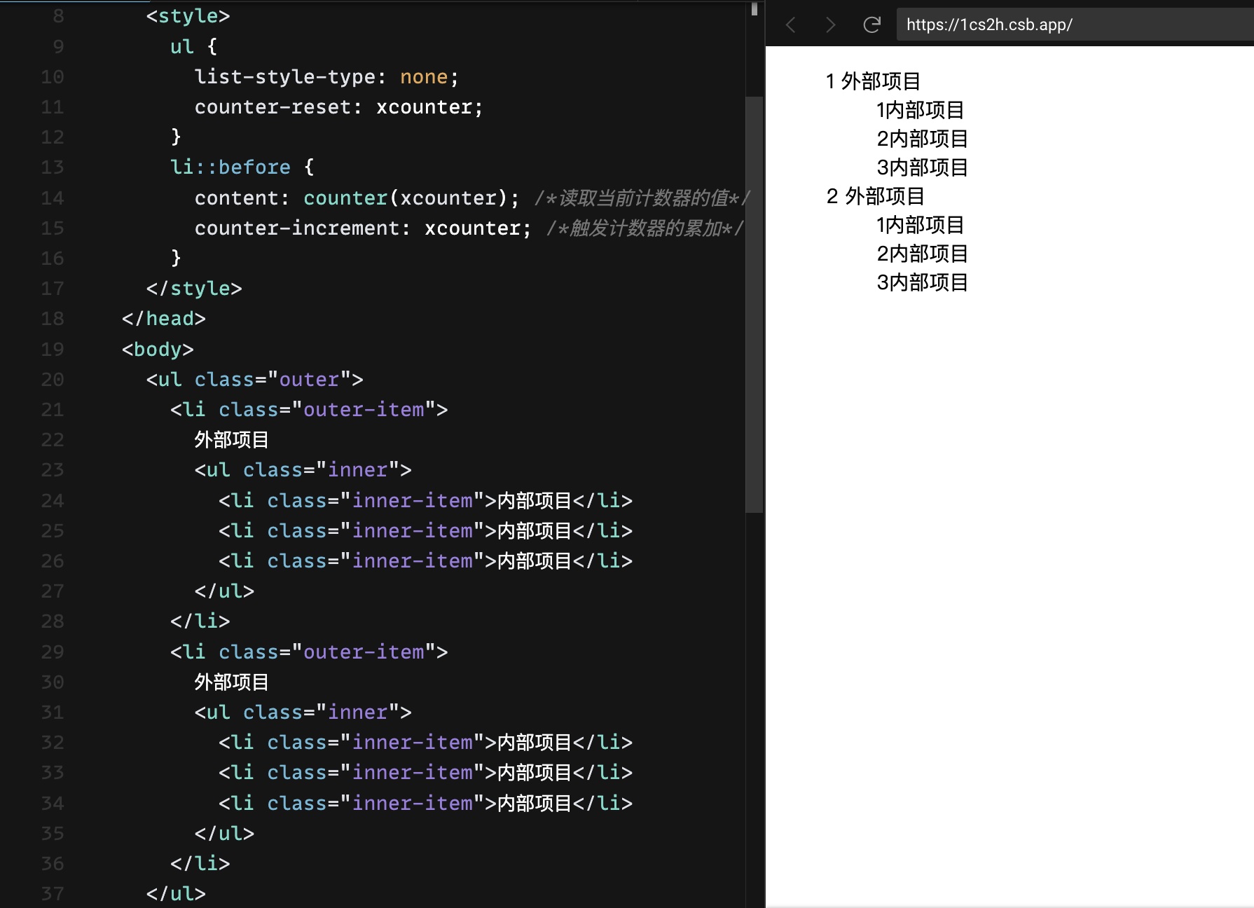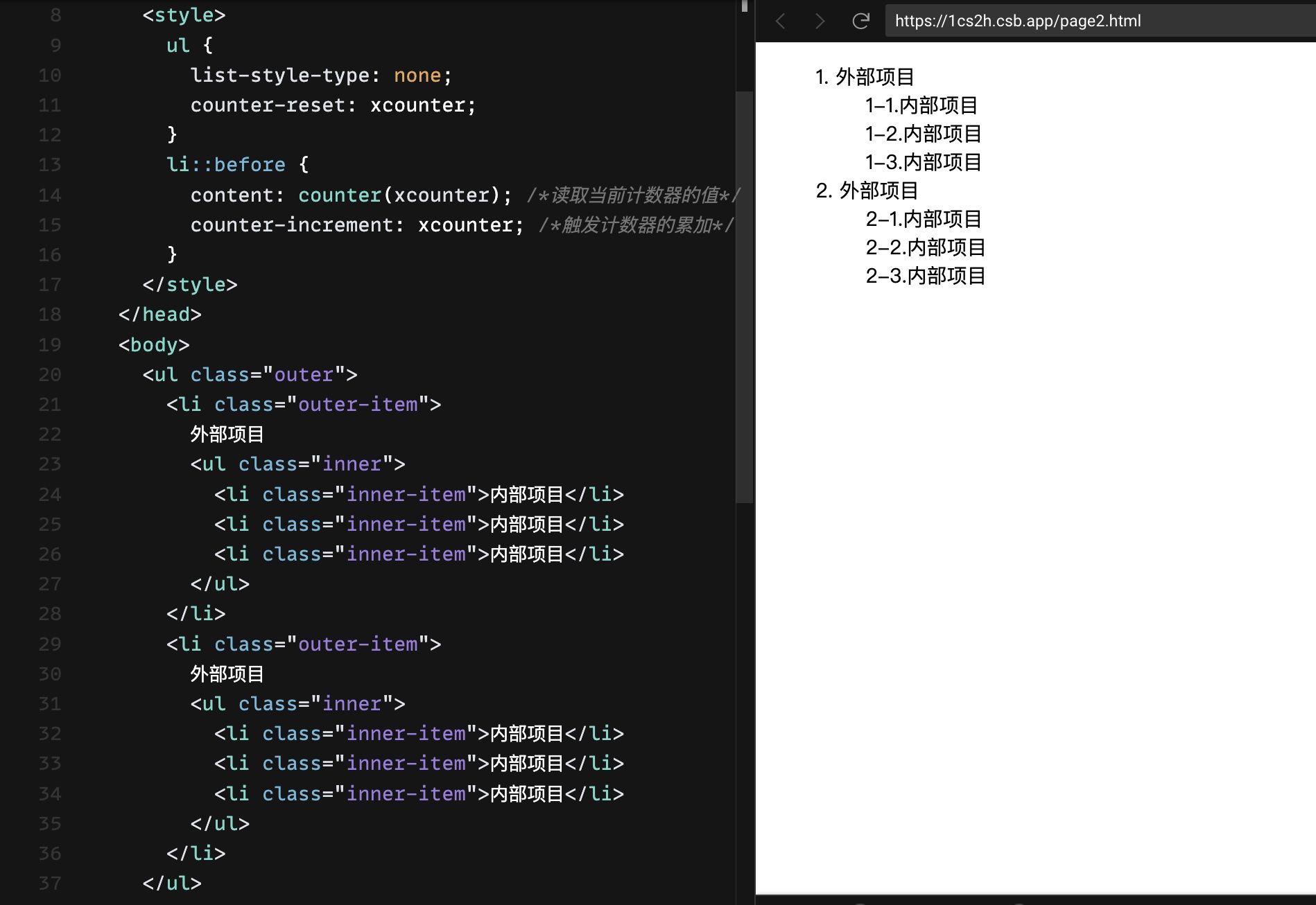 每当遇到 ul 时,计数器都会重置,导致二级内容并没有继承一级内容,这时就需要counters():一个能嵌套计数的方法,他能够记住父级的值,现在用 counters替换counter(counters 还需要第二个参数用来设置拼接字符)