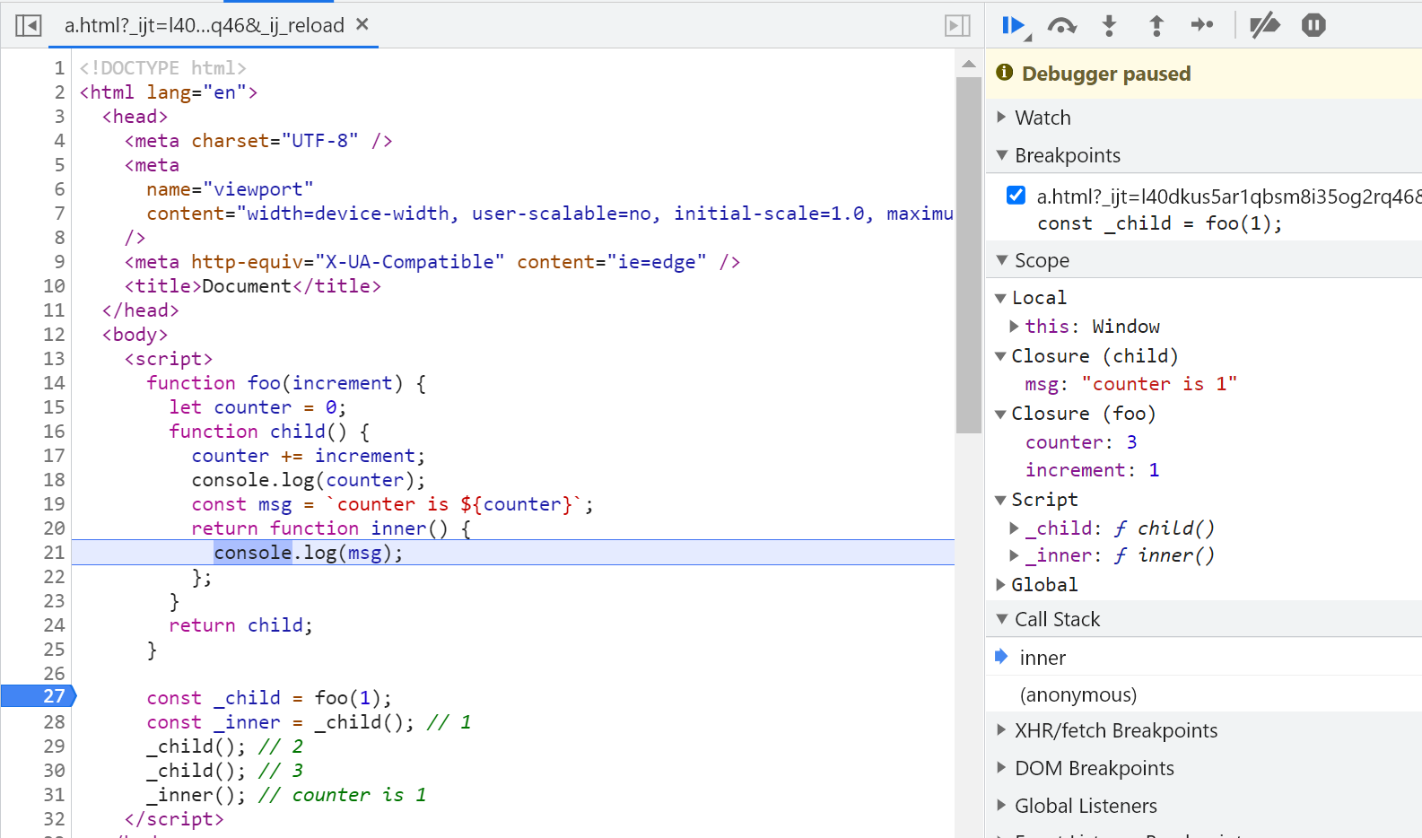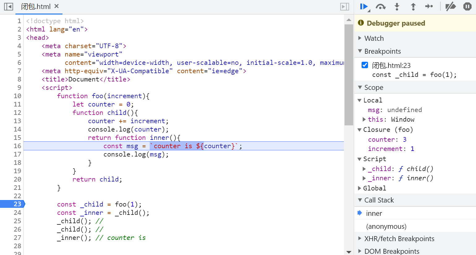 function foo(increment){ let counter = 0; function child(){ counter += increment; console.log(counter); return function inner(){ const msg = `counter is ${counter}`; console.log(msg); } } return child; } const _child = foo(1); const _inner = _child(); // 1 _child(); // 2 _child(); // 3 _inner(); // counter is 3从下图可以看到,在运行最后的 _inner() 时,并没有形成两个 Closure(闭包):
