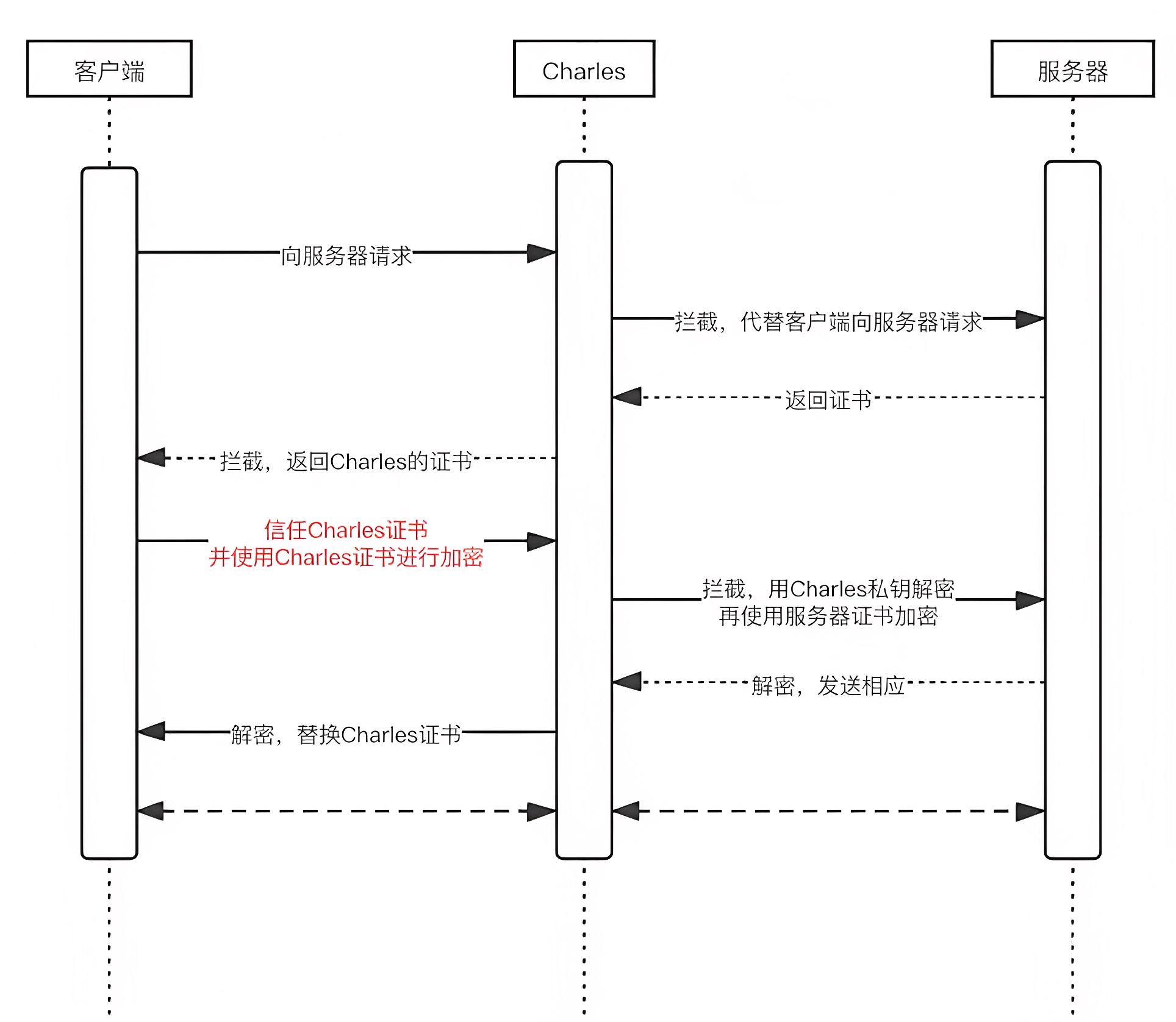 如果在根证书中加入数字证书K,就能让浏览器信任该证书,就可以实施中间人攻击了,charles就是使用这种模式来抓包 Https 的。