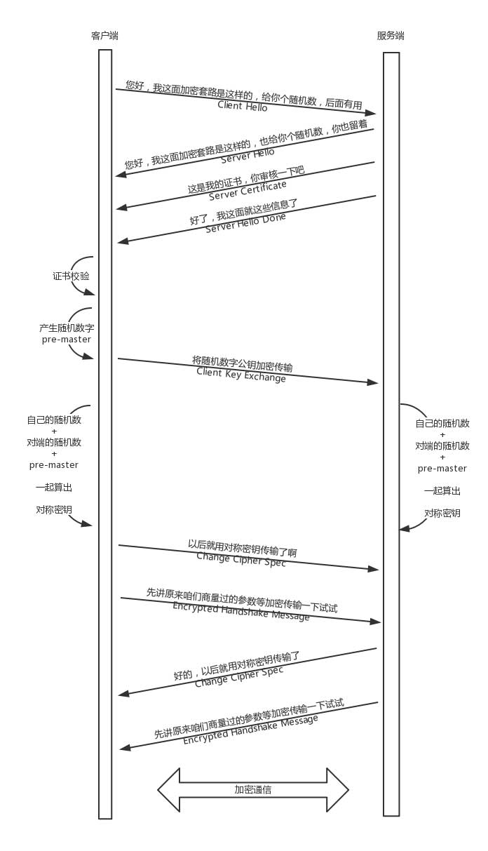 现在双方都存在:客户端的随机数、服务端的随机数、对称加密用的随机数,使用这几个参数生成对称加密的秘钥,那么现在就可以尝试使用对称加密进行传输了。